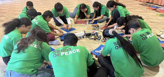 Following a talkative lunch break, campers moved into rest hour before transitioning into the afternoon activity blocks. Dialogue groups explored how culture permeates individual and collective belief systems, examining personal identity and their relationships with the cultures present in society and at home. Campers engaged in peer sharing around the belief systems of the ‘other side,’ reflecting on both similarities and differences. With Group Challenge suspended for the day, we gave Dialogue groups a block of unstructured time—an opportunity to unwind, connect with new friends, and slow the pace. The afternoon unfolded through bracelet-making, board games, reading, shared snacks, and music. Groups also rotated through Nature Play with Kunal, and sports including volleyball, badminton, and jump rope, led by Yusra, Ali, and Falak.